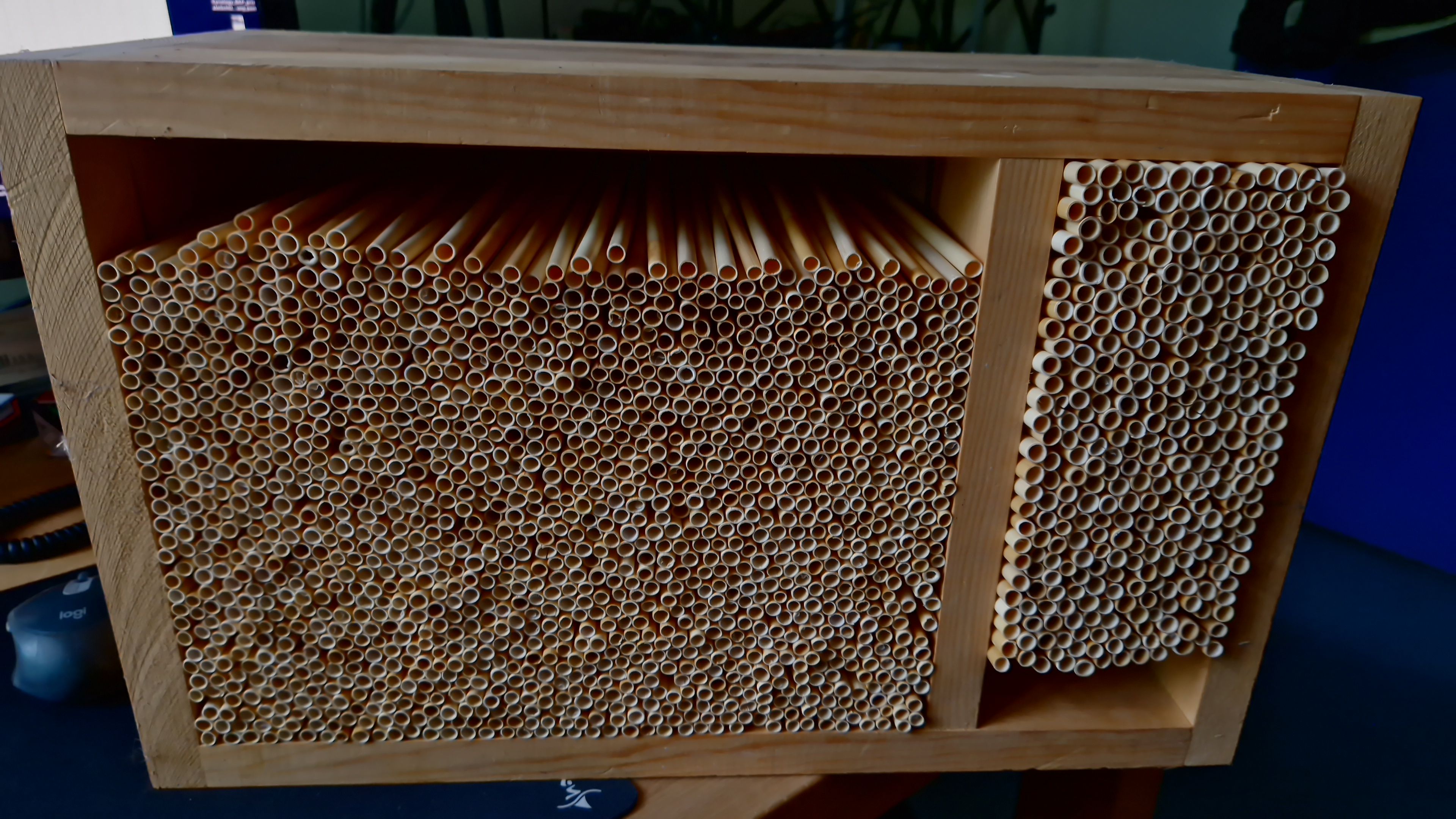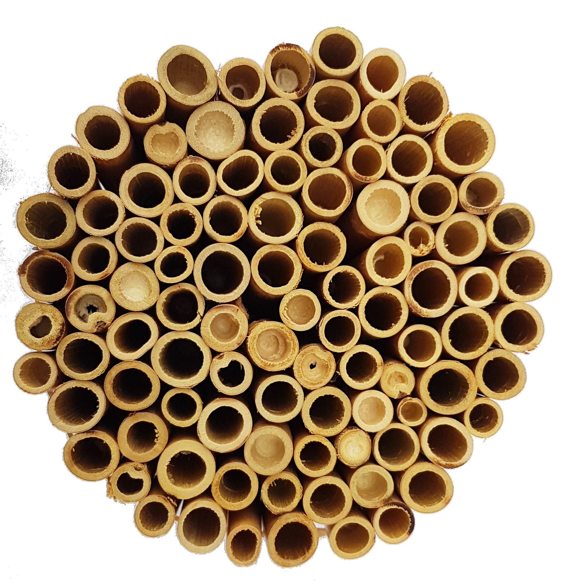 Dies ist auch ein großer Vorteil gegenüber Papierröllchen, die maschinell produziert werden und aufgrund der normierten Durchmesser nur wenige Arten ansprechen. Zusätzlich ist Schilfrohr von Natur aus wasserresistent und damit vor den Witterungsbedingungen besser geschützt als Pappe, die, wenn sie feucht wird, ihre Formstabilität verliert oder im schlimmsten Falle zu schimmeln beginnt.