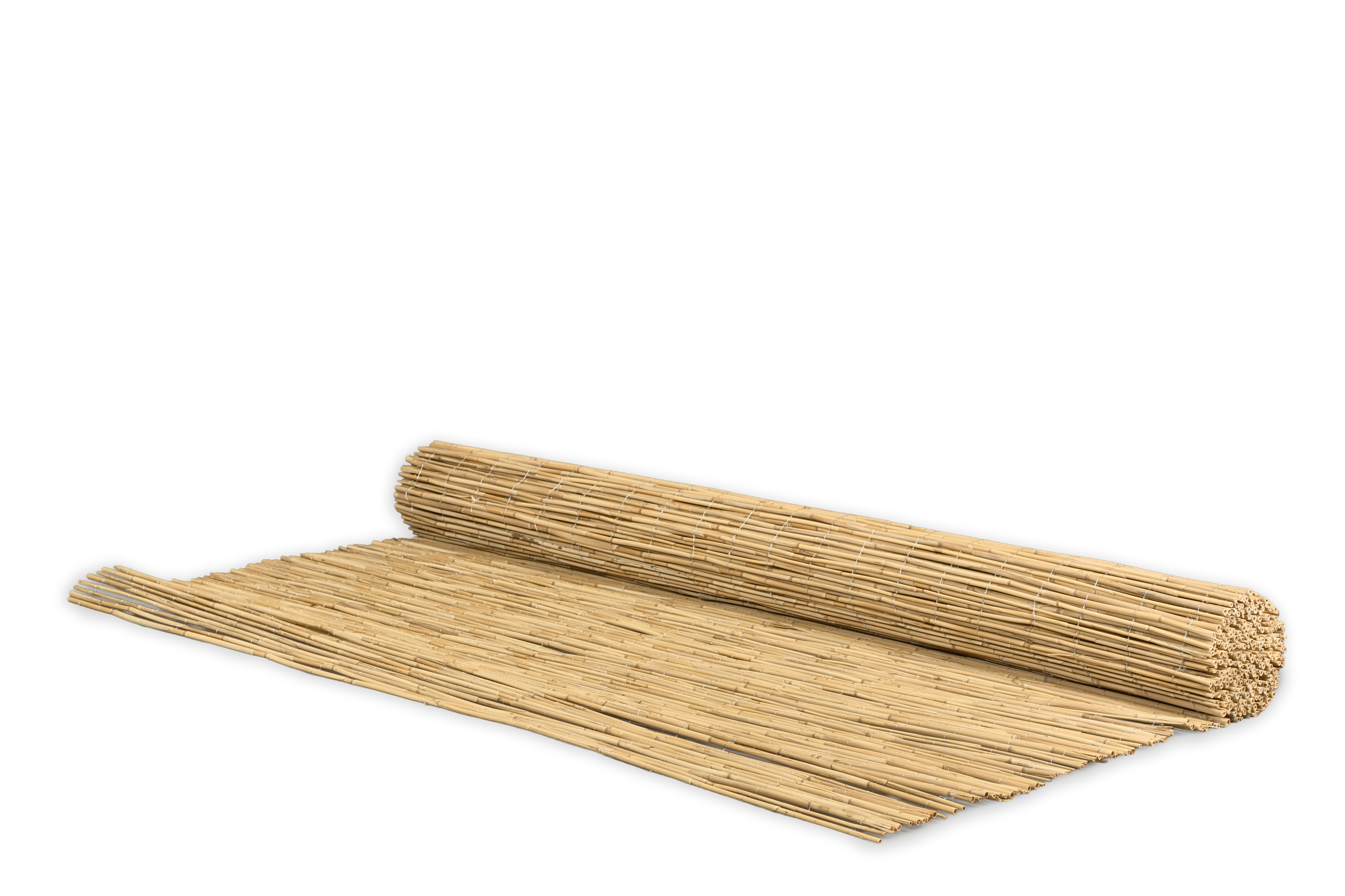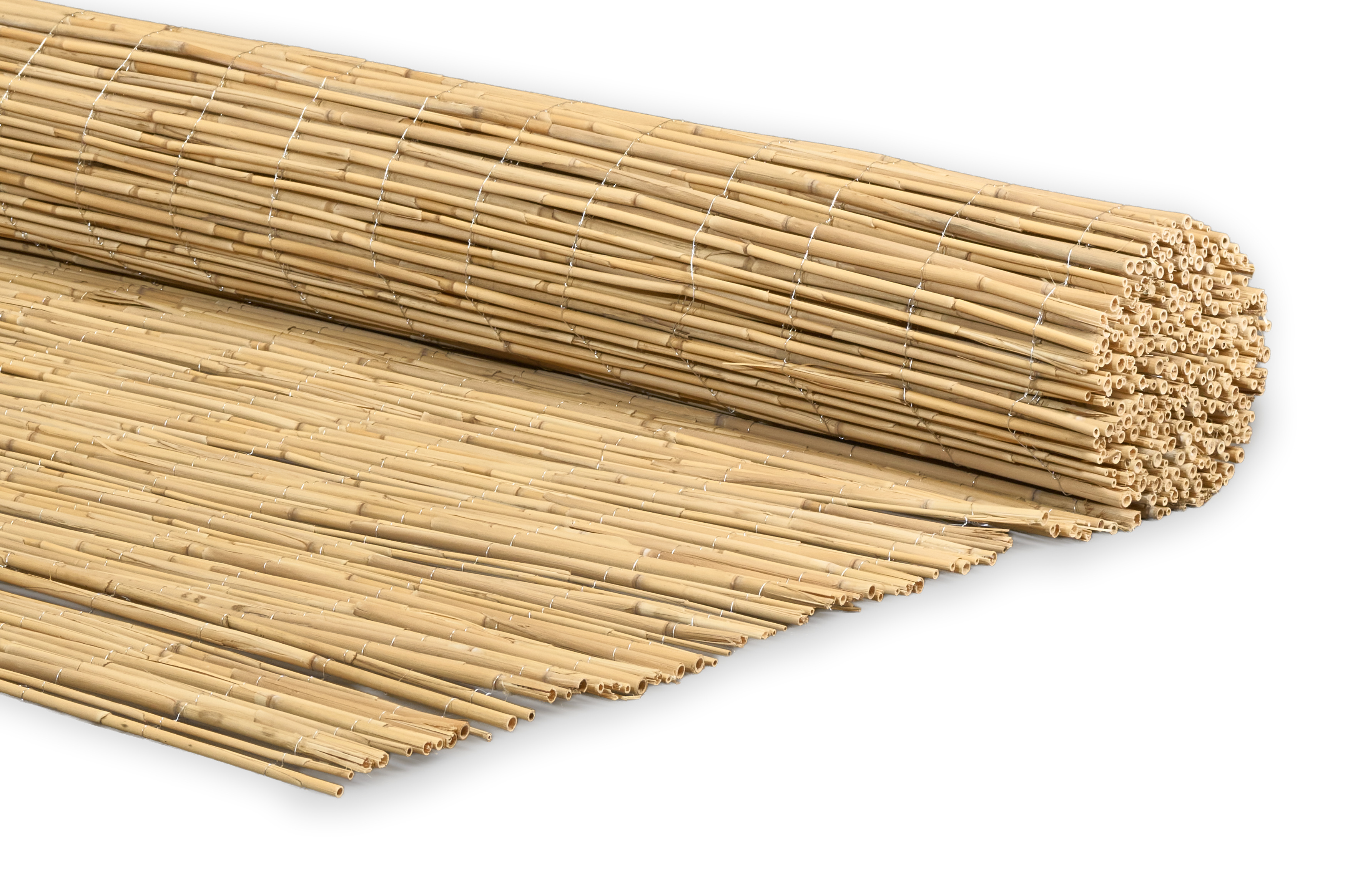 Extra starkes Schilfgewebe aus ausgesuchten, stabilen Halmen. Mit verzinktem Draht gebunden, ca. 60-65 Halme je laufenden Meter. Der Bindedrahtabstand beträgt jeweils ca. 10 cm.