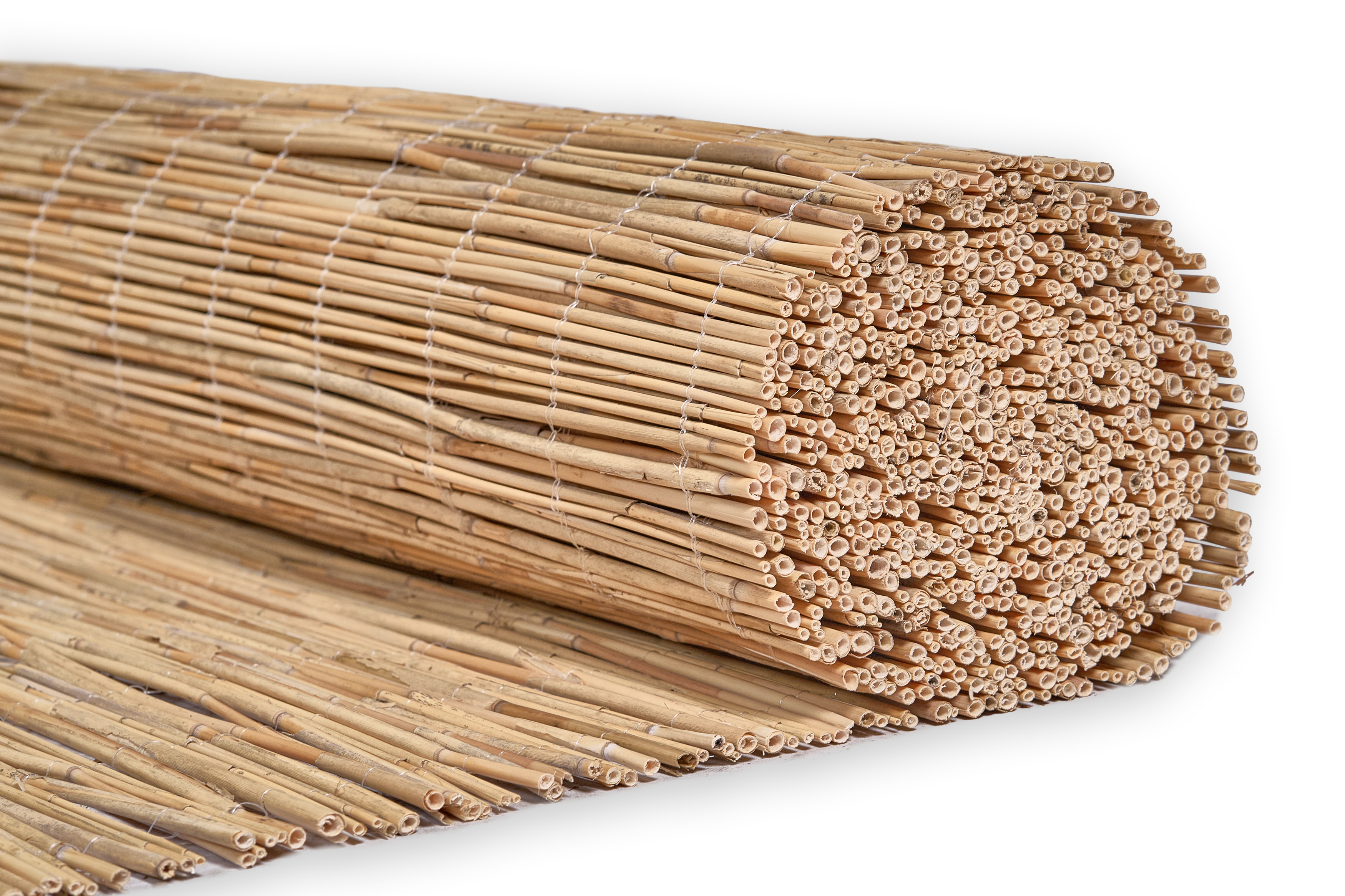 Ungeschälte Reethalme bilden die Grundlage der Hiss Schilfmatte Classic. Sie werden sorgfältig mit einem transparenten, UV-beständigen Nylonband zusammengebunden – ganz ohne sichtbare Drahtverbindungen. Diese moderne, rostfreie Bindung gewährleistet eine dauerhaft stabile Konstruktion im Außenbereich. Etwa 100 Halme pro laufendem Meter bilden eine robuste Basis.