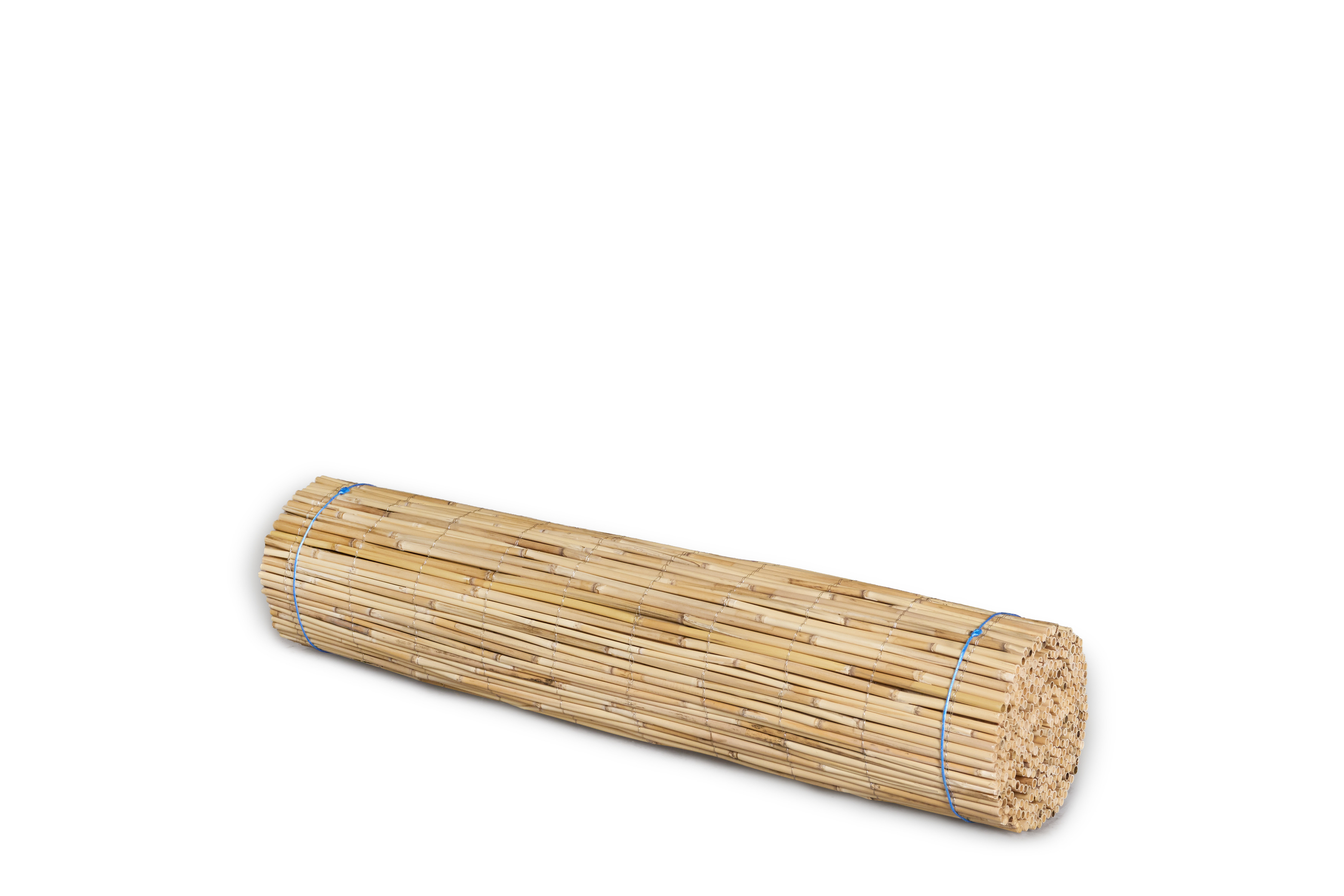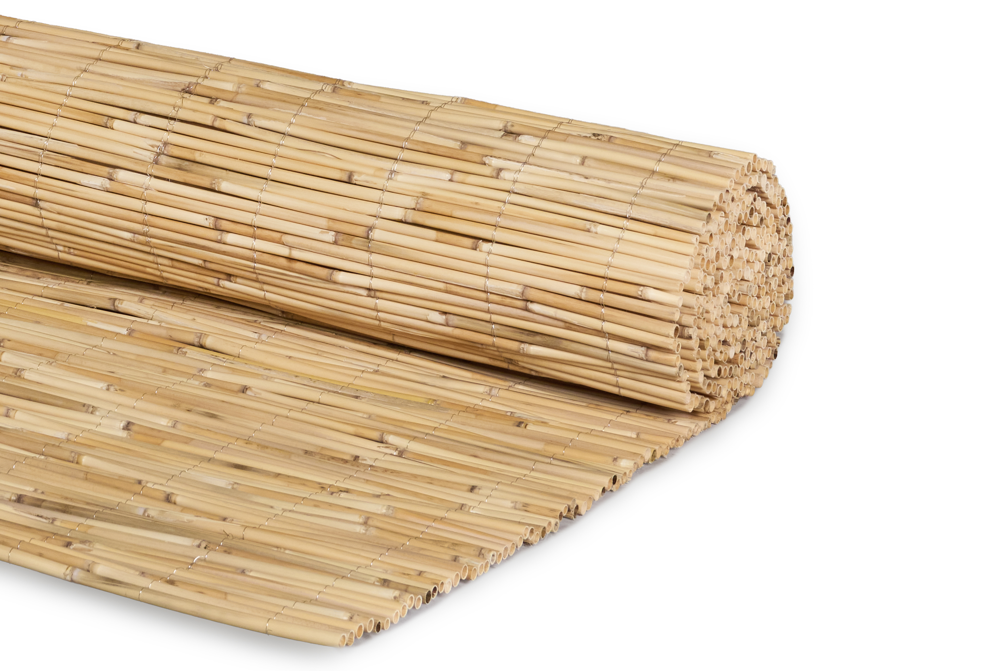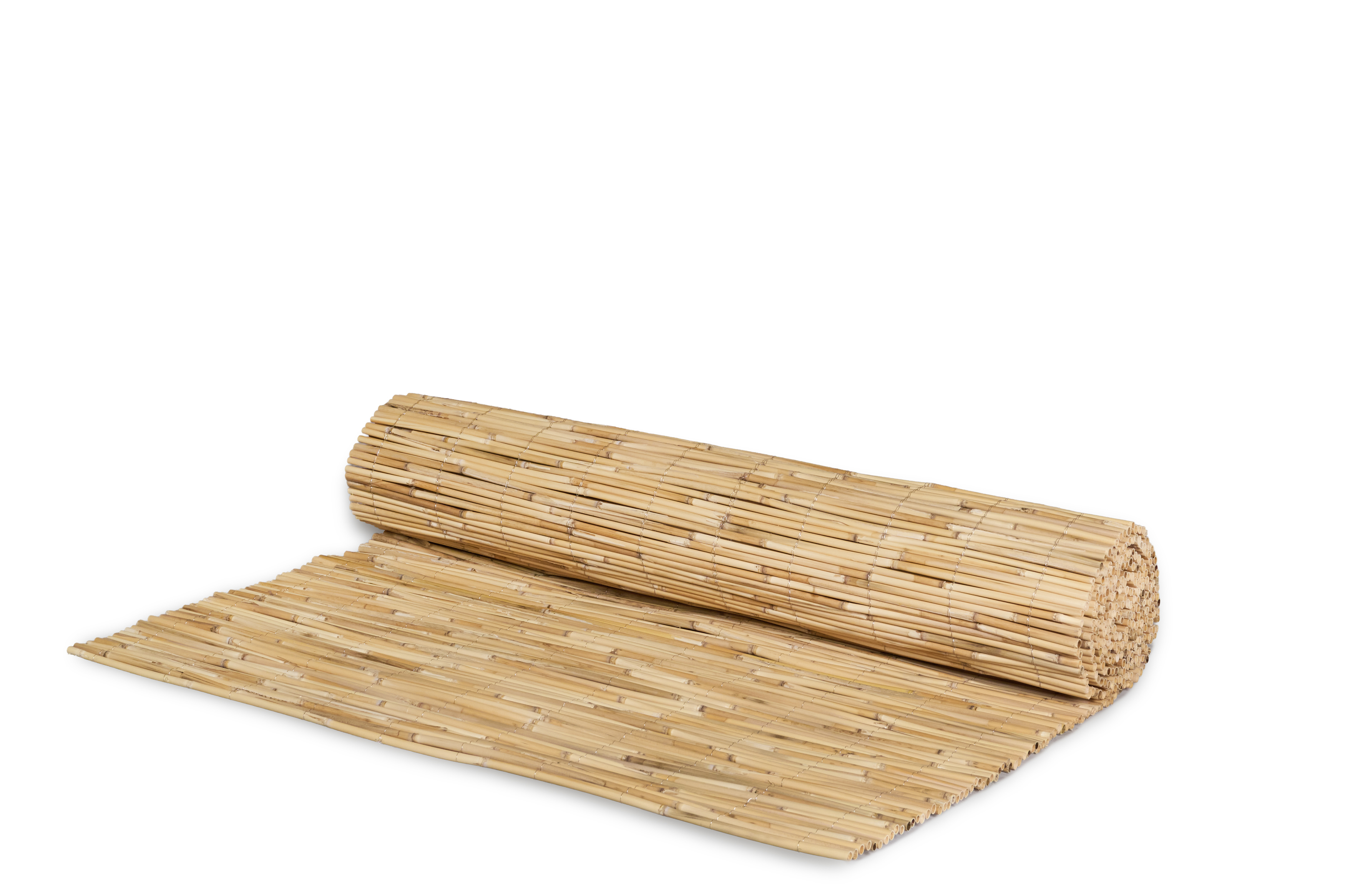 Die Hiss Schilfmatte Premium besteht aus rund 100 sorgfältig geschälten Schilfhalmen pro laufendem Meter. Diese weisen einen Durchmesser von 5 bis 12 mm auf und werden mit rostfreiem Edelstahldraht stabil und dauerhaft verbunden.