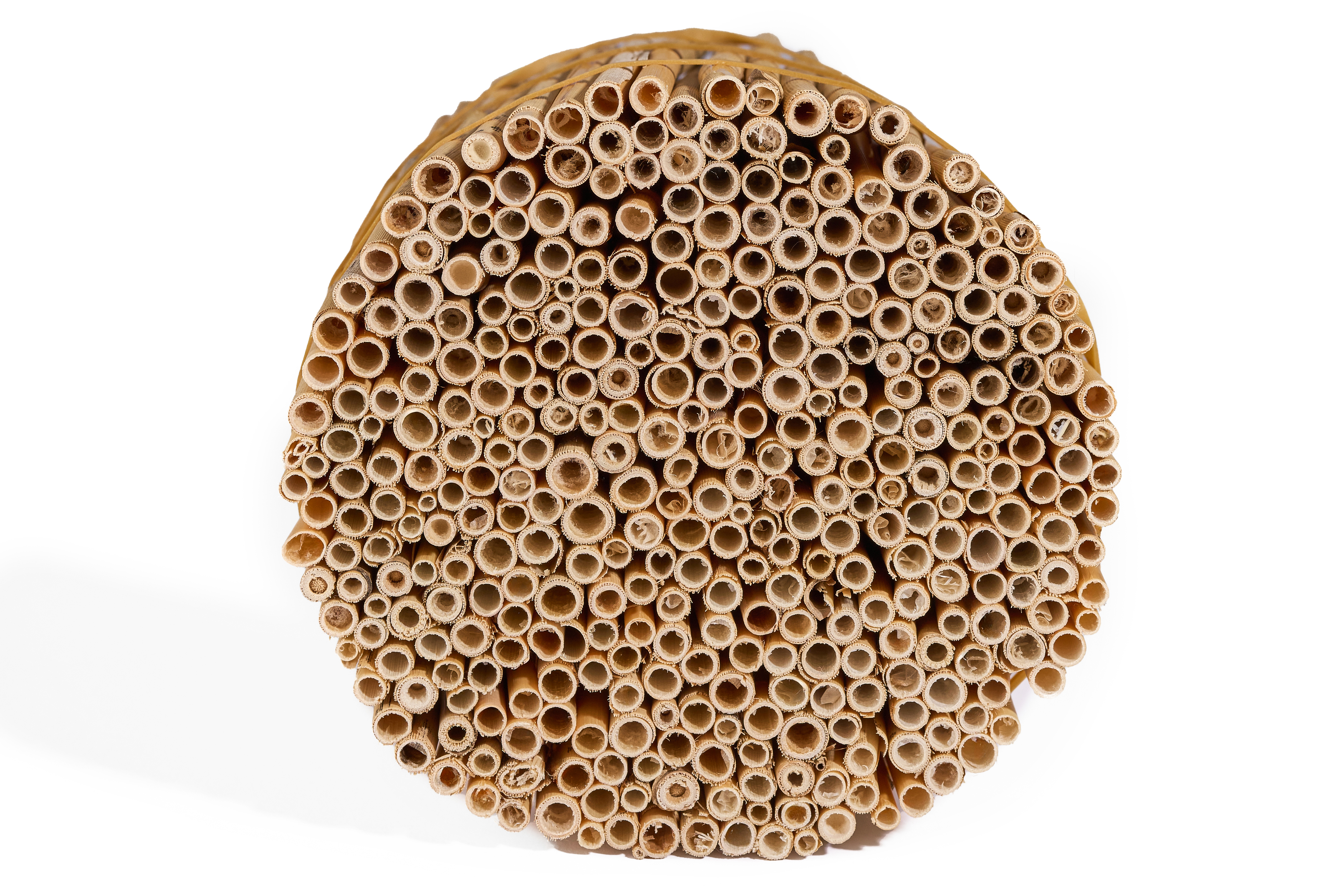 - Auf die Position der Wachstumsknoten achten. An diesen Knoten ist der Halm nicht durchgängig und stellt somit eine Begrenzung der Halmlänge dar. Ist die Halmlänge zu kurz bzw. befindet sich hinter der Öffnung gleich ein Wachstumknoten werden diese Röhren nicht angenommen. Daher besser die Halme so sortieren, dass das jeweils längere Halmende nach außen zeigt.