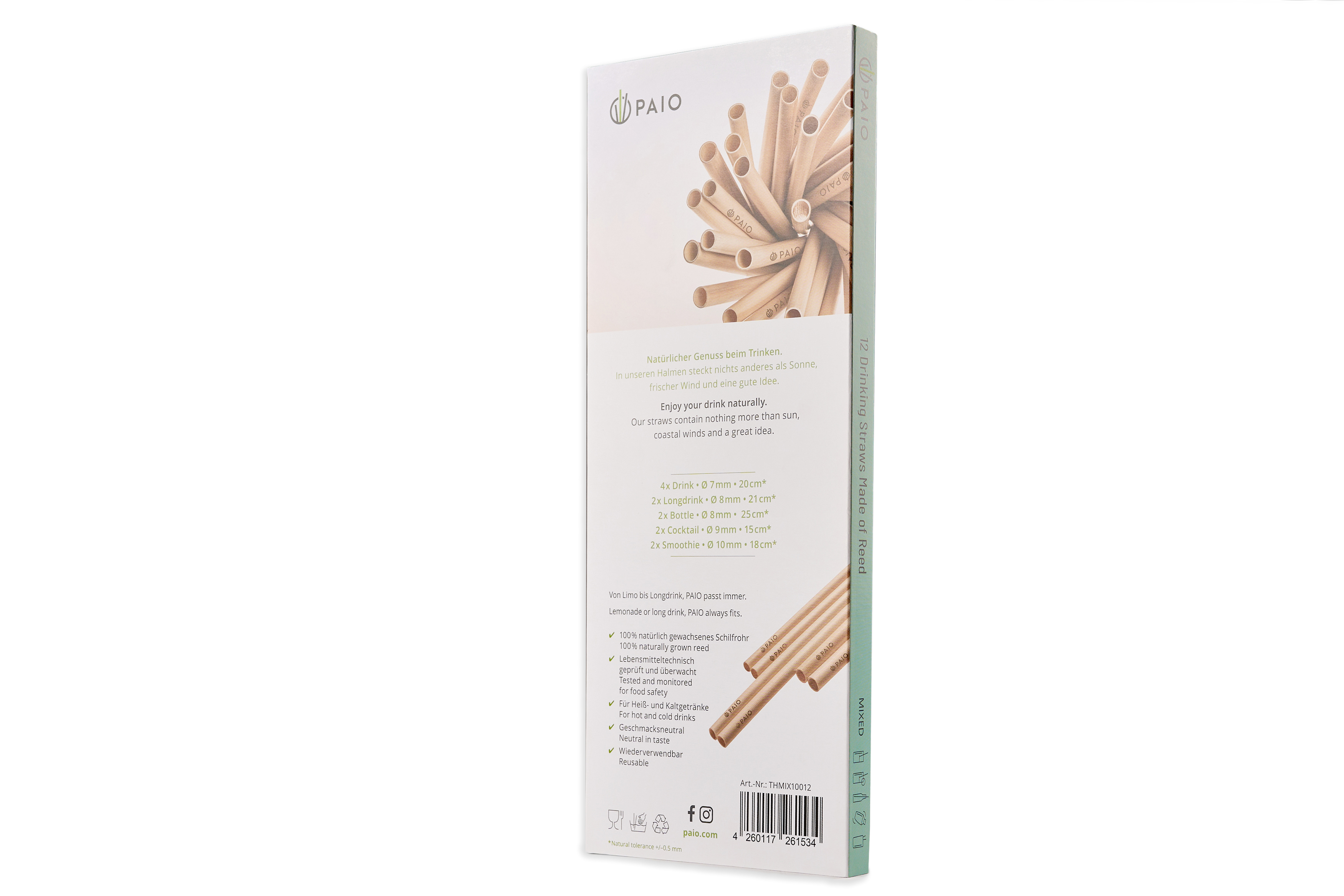 Der Durchmesser beläuft sich auf circa acht Millimeter und liegt damit sozusagen in der goldenen Mitte zwischen den Halmen für dünnflüssige Drinks und solchen für dickflüssige Smoothies. Mit dieser Dicke empfehlen sich die PAIO-Trinkhalme für Longdrinks und Highballs sowie auch für Flaschen bis 0,2 Liter.