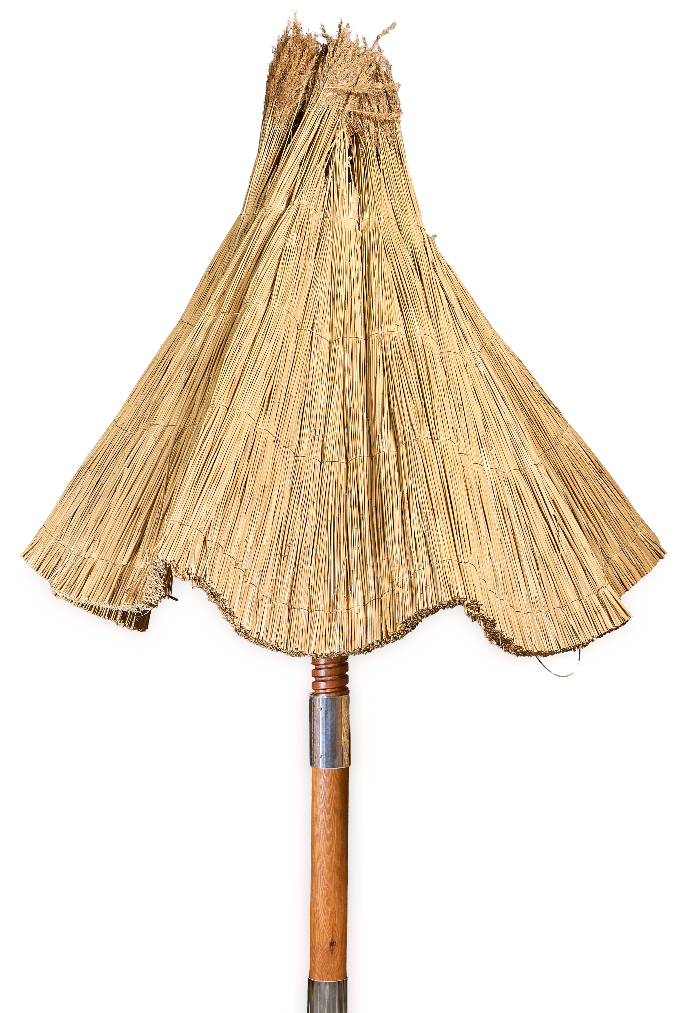 - Bei einem kurzen Regenguss schützt ein Strohschirm vor Nässe.