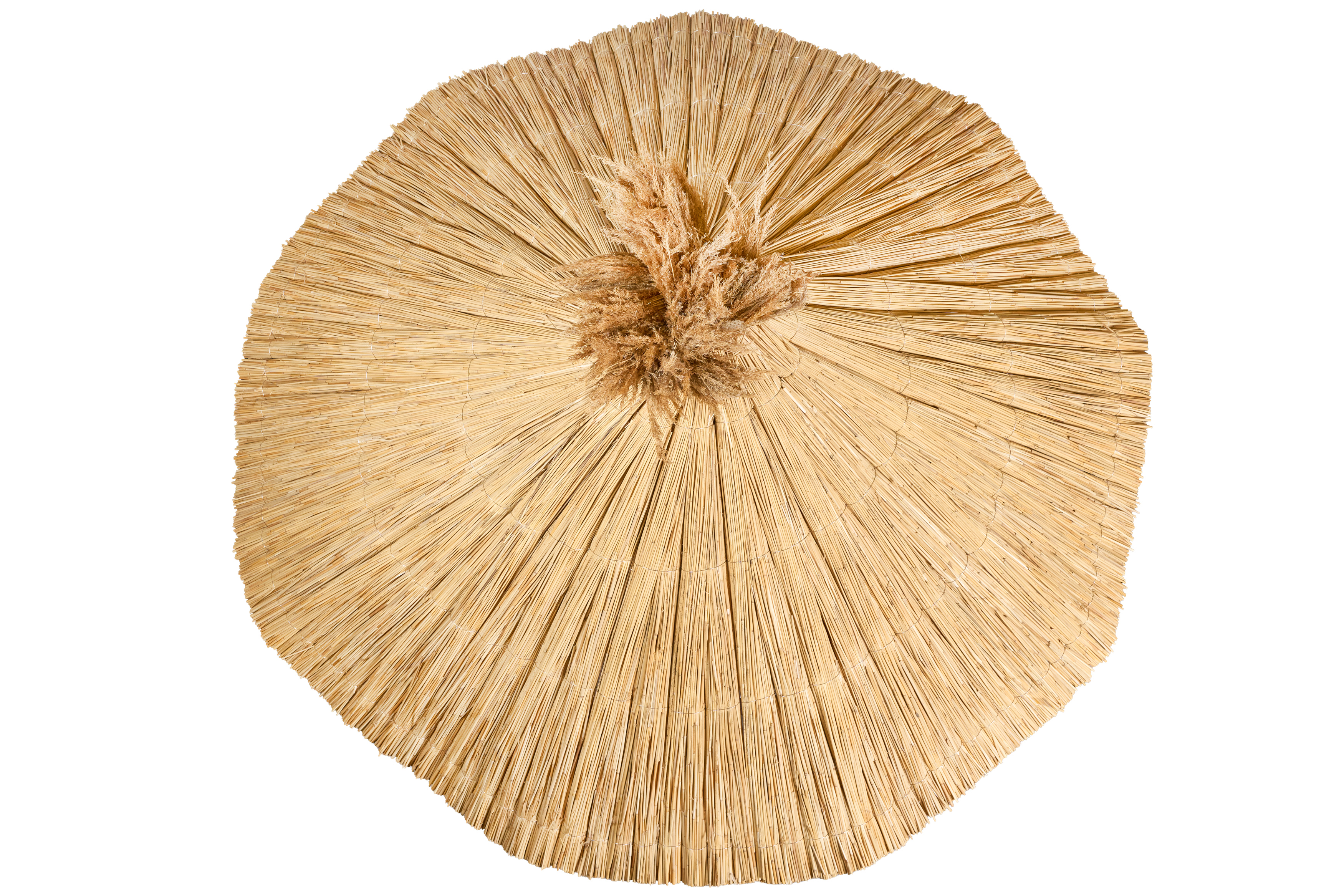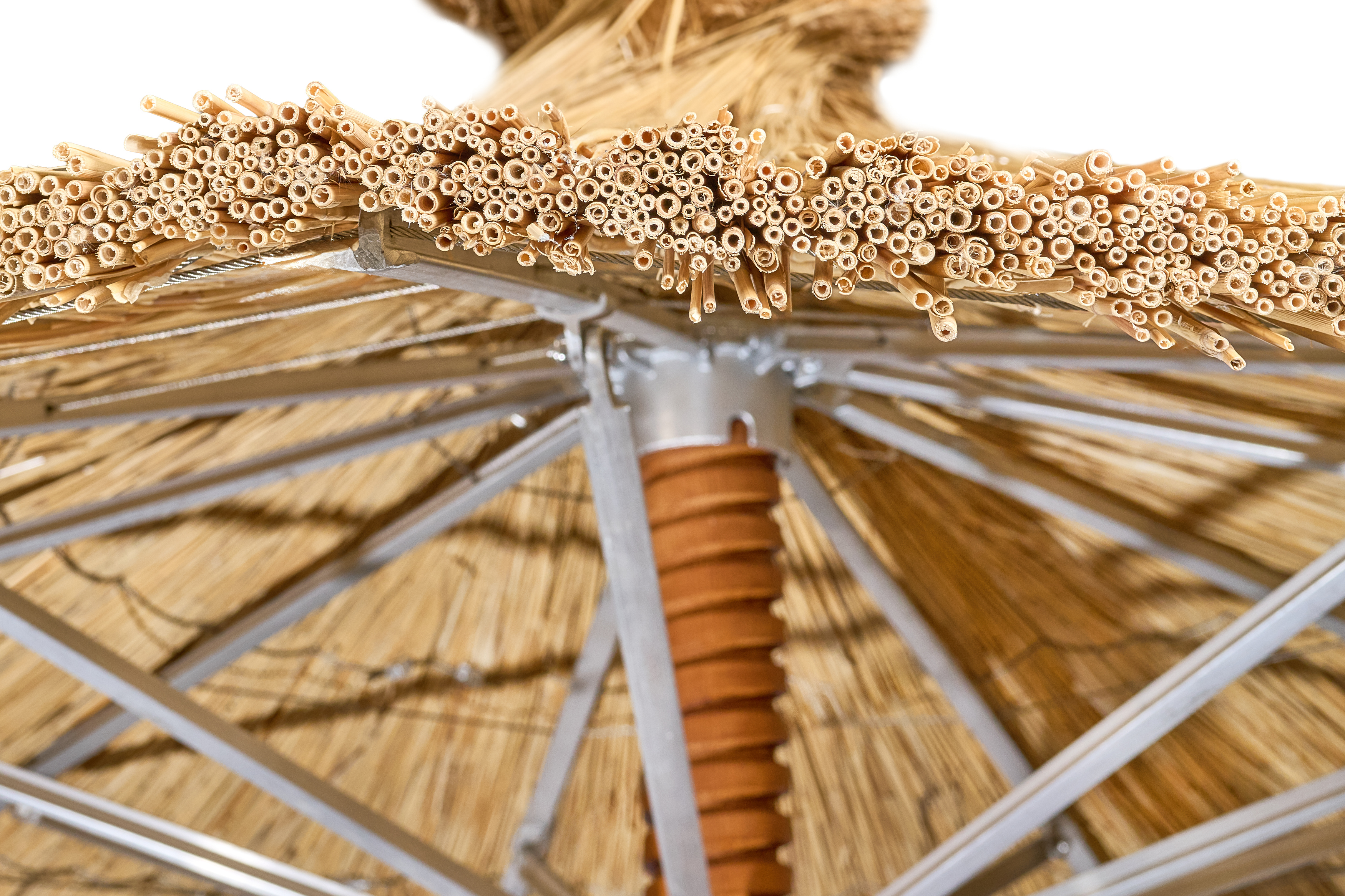 Der Sombrilla Cana Volver hat einen 10 cm starken Naturholzpfosten, ein drehbares Untergestell aus Aluminium und eine Auflage aus Schilfrohr. Der Strohschirm hat ein klassisches Design. Auffällig ist die verspielte Haube mit den gedrehten und naturbelassen Reetenden. Trotz der dichten Auflage ist der Schirm leicht in der Handhabung. Da wir mit ausgesucht hochwertigen und wetterfesten Materialien arbeiten, kann der Sonnenschirm bei Wind und Wetter draußen bleiben. So haben Sie auch bei schlechtem Wetter immer einen besonderen Anblick.